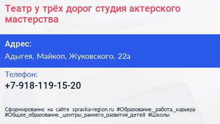 Театр у трёх дорог, студия актерского мастерства по адресу Адыгея, Майкоп, Жуковского, 22а в дальнейшем Организация, размещена в следующих категориях: