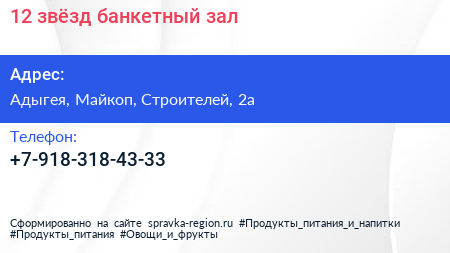 12 звёзд, банкетный зал по адресу Адыгея, Майкоп, Строителей, 2а в дальнейшем Организация, размещена в следующих категориях: