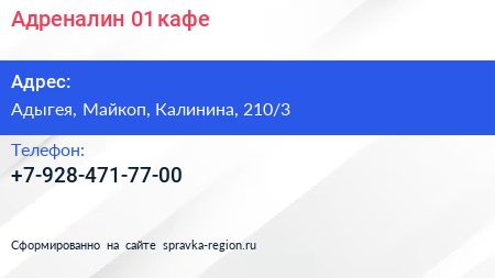Адреналин 01, кафе по адресу Адыгея, Майкоп, Калинина, 210/3 в дальнейшем Организация, размещена в следующих категориях: