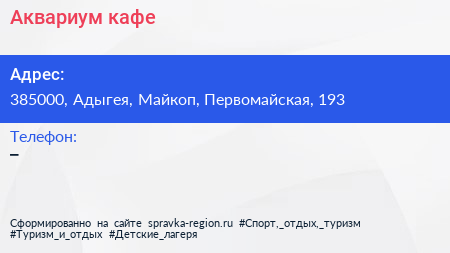 Аквариум, кафе по адресу 385000, Адыгея, Майкоп, Первомайская, 193 в дальнейшем Организация, размещена в следующих категориях: