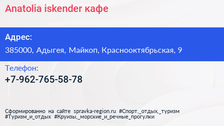 Anatolia iskender, кафе по адресу 385000, Адыгея, Майкоп, Краснооктябрьская, 9 в дальнейшем Организация, размещена в следующих категориях: