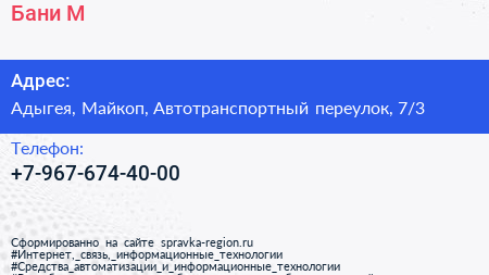 Бани М по адресу Адыгея, Майкоп, Автотранспортный переулок, 7/3 в дальнейшем Организация, размещена в следующих категориях: