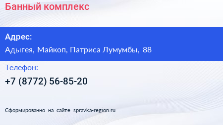 Банный комплекс по адресу Адыгея, Майкоп, Патриса Лумумбы, 88 в дальнейшем Организация, размещена в следующих категориях: