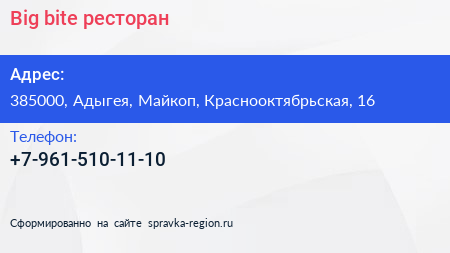 Big bite, ресторан по адресу 385000, Адыгея, Майкоп, Краснооктябрьская, 16 в дальнейшем Организация, размещена в следующих категориях: