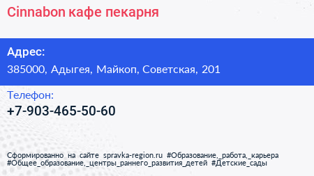 Cinnabon, кафе-пекарня по адресу 385000, Адыгея, Майкоп, Советская, 201 в дальнейшем Организация, размещена в следующих категориях:
