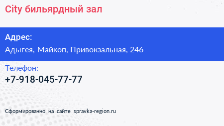 City, бильярдный зал по адресу Адыгея, Майкоп, Привокзальная, 246 в дальнейшем Организация, размещена в следующих категориях: