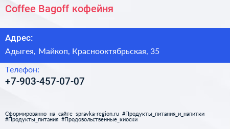 Coffee Bagoff, кофейня по адресу Адыгея, Майкоп, Краснооктябрьская, 35 в дальнейшем Организация, размещена в следующих категориях: