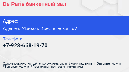 De Paris, банкетный зал по адресу Адыгея, Майкоп, Крестьянская, 69 в дальнейшем Организация, размещена в следующих категориях: