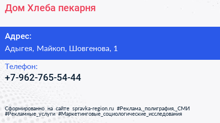 Дом Хлеба, пекарня по адресу Адыгея, Майкоп, Шовгенова, 1 в дальнейшем Организация, размещена в следующих категориях: