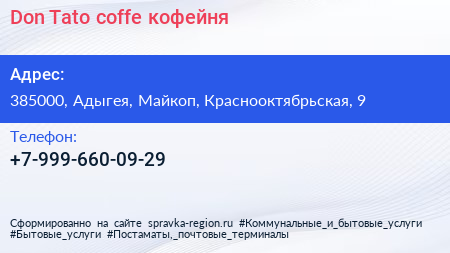 Don Tato coffe, кофейня по адресу 385000, Адыгея, Майкоп, Краснооктябрьская, 9 в дальнейшем Организация, размещена в следующих категориях: