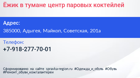 Ёжик в тумане, центр паровых коктейлей по адресу 385000, Адыгея, Майкоп, Советская, 201а в дальнейшем Организация, размещена в следующих категориях:
