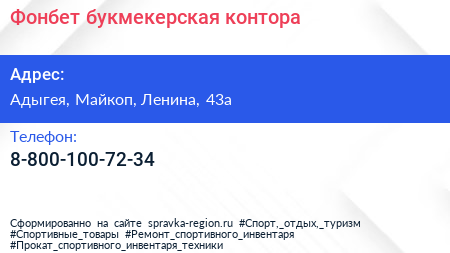 Фонбет, букмекерская контора по адресу Адыгея, Майкоп, Ленина, 43а в дальнейшем Организация, размещена в следующих категориях:
