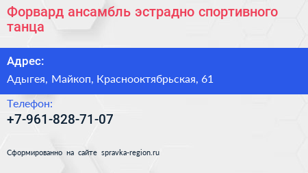 Форвард, ансамбль эстрадно-спортивного танца по адресу Адыгея, Майкоп, Краснооктябрьская, 61 в дальнейшем Организация, размещена в следующих категориях: