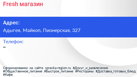 Fresh, магазин по адресу Адыгея, Майкоп, Пионерская, 327 в дальнейшем Организация, размещена в следующих категориях: