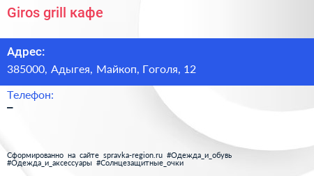 Giros grill, кафе по адресу 385000, Адыгея, Майкоп, Гоголя, 12 в дальнейшем Организация, размещена в следующих категориях: