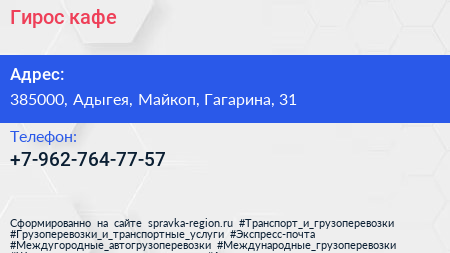 Гирос, кафе по адресу 385000, Адыгея, Майкоп, Гагарина, 31 в дальнейшем Организация, размещена в следующих категориях: