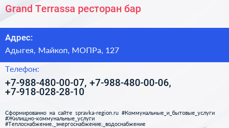 Grand Terrassa, ресторан-бар по адресу Адыгея, Майкоп, МОПРа, 127 в дальнейшем Организация, размещена в следующих категориях: