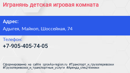 Игранянь, детская игровая комната по адресу Адыгея, Майкоп, Шоссейная, 74 в дальнейшем Организация, размещена в следующих категориях: