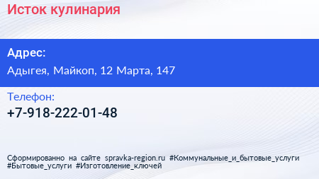 Исток, кулинария по адресу Адыгея, Майкоп, 12 Марта, 147 в дальнейшем Организация, размещена в следующих категориях: