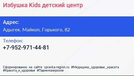 Избушка Kids, детский центр по адресу Адыгея, Майкоп, Горького, 82 в дальнейшем Организация, размещена в следующих категориях: