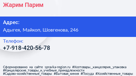 Жарим Парим по адресу Адыгея, Майкоп, Шовгенова, 246 в дальнейшем Организация, размещена в следующих категориях: