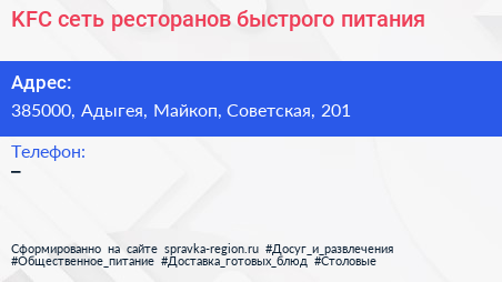 KFC, сеть ресторанов быстрого питания по адресу 385000, Адыгея, Майкоп, Советская, 201 в дальнейшем Организация, размещена в следующих категориях:
