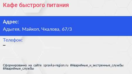 Кафе быстрого питания по адресу Адыгея, Майкоп, Чкалова, 67/3 в дальнейшем Организация, размещена в следующих категориях: