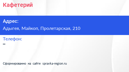 Кафетерий по адресу Адыгея, Майкоп, Пролетарская, 210 в дальнейшем Организация, размещена в следующих категориях:
