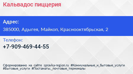Кальвадос, пиццерия по адресу 385000, Адыгея, Майкоп, Краснооктябрьская, 2 в дальнейшем Организация, размещена в следующих категориях: