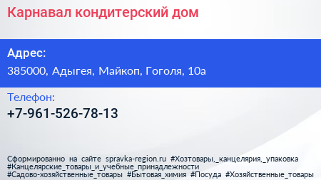 Карнавал, кондитерский дом по адресу 385000, Адыгея, Майкоп, Гоголя, 10а в дальнейшем Организация, размещена в следующих категориях: