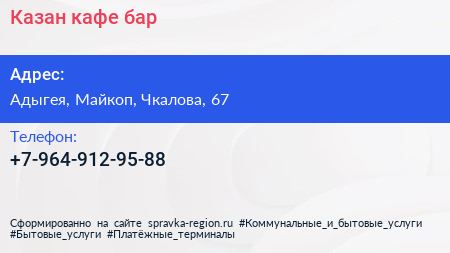 Казан, кафе-бар по адресу Адыгея, Майкоп, Чкалова, 67 в дальнейшем Организация, размещена в следующих категориях:
