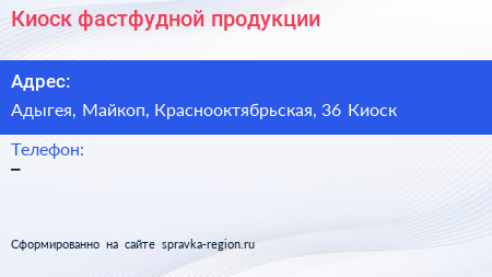 Киоск фастфудной продукции по адресу Адыгея, Майкоп, Краснооктябрьская, 36 Киоск в дальнейшем Организация, размещена в следующих категориях: