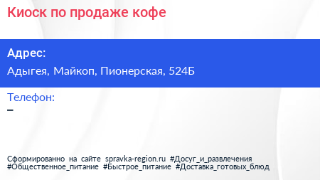 Киоск по продаже кофе по адресу Адыгея, Майкоп, Пионерская, 524Б в дальнейшем Организация, размещена в следующих категориях: