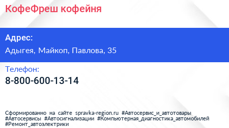 КофеФреш, кофейня по адресу Адыгея, Майкоп, Павлова, 35 в дальнейшем Организация, размещена в следующих категориях: