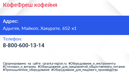 КофеФреш, кофейня по адресу Адыгея, Майкоп, Хакурате, 652 к1 в дальнейшем Организация, размещена в следующих категориях: