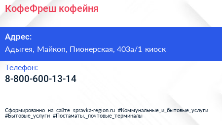 КофеФреш, кофейня по адресу Адыгея, Майкоп, Пионерская, 403а/1 киоск в дальнейшем Организация, размещена в следующих категориях: