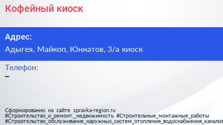 Кофейный киоск по адресу Адыгея, Майкоп, Юннатов, 3/а киоск в дальнейшем Организация, размещена в следующих категориях: