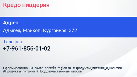 Кредо, пиццерия по адресу Адыгея, Майкоп, Курганная, 372 в дальнейшем Организация, размещена в следующих категориях: