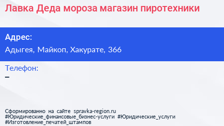 Лавка Деда мороза, магазин пиротехники по адресу Адыгея, Майкоп, Хакурате, 366 в дальнейшем Организация, размещена в следующих категориях:
