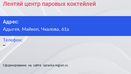 Лентяй, центр паровых коктейлей по адресу Адыгея, Майкоп, Чкалова, 61а в дальнейшем Организация, размещена в следующих категориях: