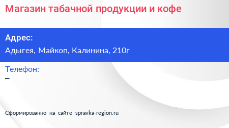 Магазин табачной продукции и кофе по адресу Адыгея, Майкоп, Калинина, 210г в дальнейшем Организация, размещена в следующих категориях: