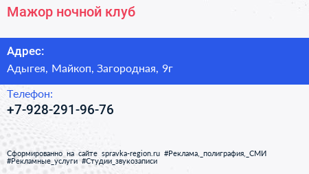 Мажор, ночной клуб по адресу Адыгея, Майкоп, Загородная, 9г в дальнейшем Организация, размещена в следующих категориях: