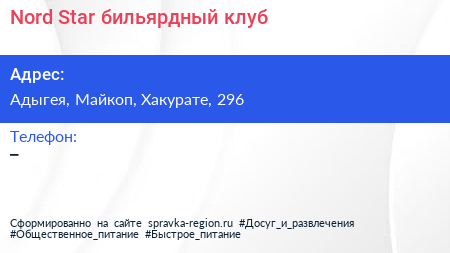 Nord Star, бильярдный клуб по адресу Адыгея, Майкоп, Хакурате, 296 в дальнейшем Организация, размещена в следующих категориях: