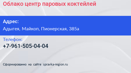 Облако, центр паровых коктейлей по адресу Адыгея, Майкоп, Пионерская, 385а в дальнейшем Организация, размещена в следующих категориях: