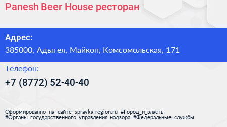 Panesh Beer House, ресторан по адресу 385000, Адыгея, Майкоп, Комсомольская, 171 в дальнейшем Организация, размещена в следующих категориях: