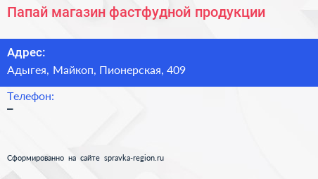 Папай, магазин фастфудной продукции по адресу Адыгея, Майкоп, Пионерская, 409 в дальнейшем Организация, размещена в следующих категориях:
