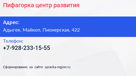 Пифагорка, центр развития по адресу Адыгея, Майкоп, Пионерская, 422 в дальнейшем Организация, размещена в следующих категориях: