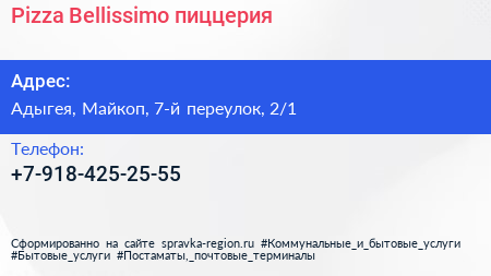 Pizza Bellissimo, пиццерия по адресу Адыгея, Майкоп, 7-й переулок, 2/1 в дальнейшем Организация, размещена в следующих категориях: