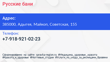 Русские бани по адресу 385000, Адыгея, Майкоп, Советская, 155 в дальнейшем Организация, размещена в следующих категориях: