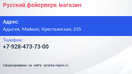 Русский фейерверк, магазин по адресу Адыгея, Майкоп, Крестьянская, 235 в дальнейшем Организация, размещена в следующих категориях:
